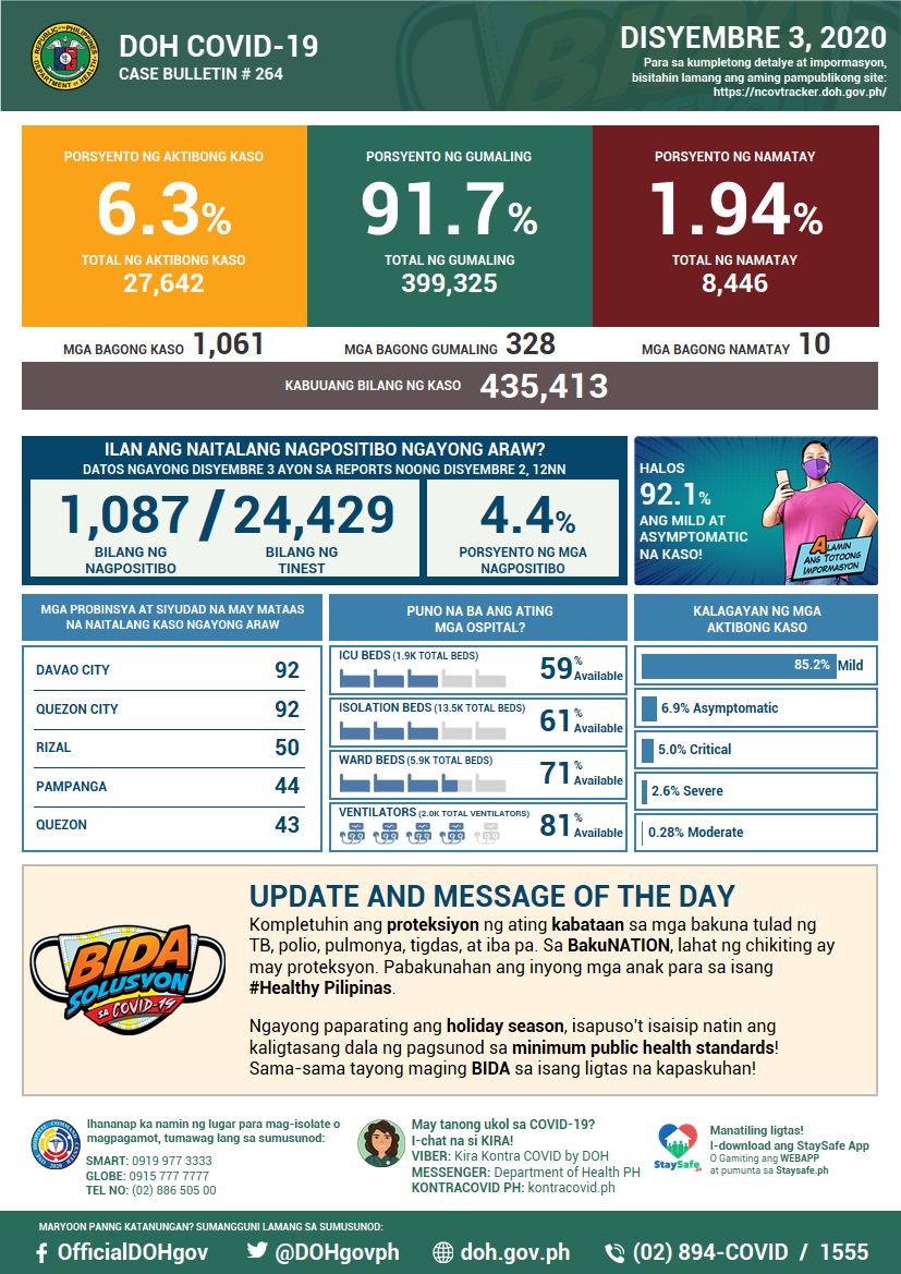 (Eagle News) — COVID-19 cases in the country breached the 435,000 mark on Thursday, Dec. 3, after the Department of Health reported 1061 more cases.