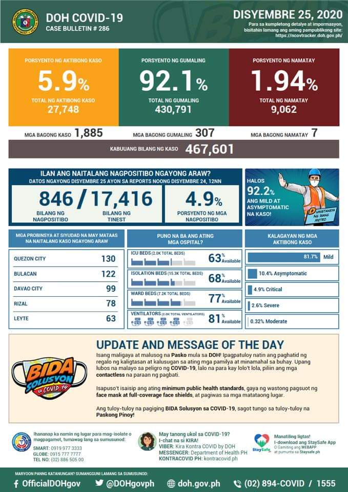 (Eagle News)–COVID-19 cases in the country breached the 467,000 mark on Friday, December 25, after the Department of Health reported 1885 additional cases.