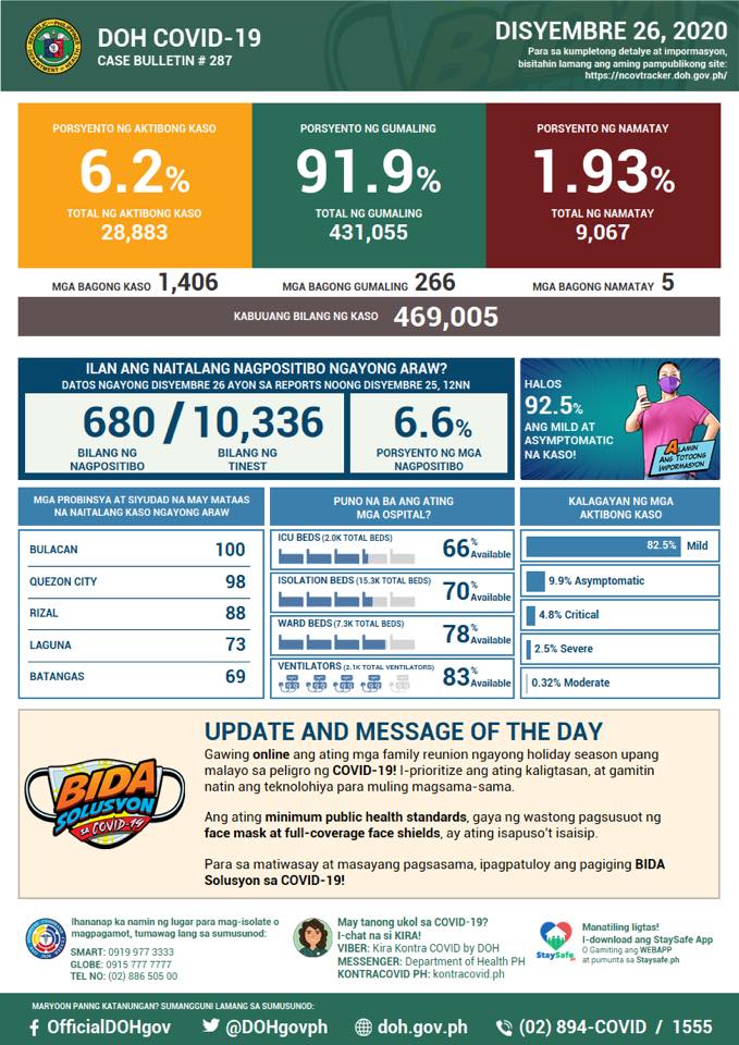 (Eagle News) — COVID-19 cases in the country breached the 469,000 mark on Saturday, December 26, after the Department of Health reported 1406 additional cases.