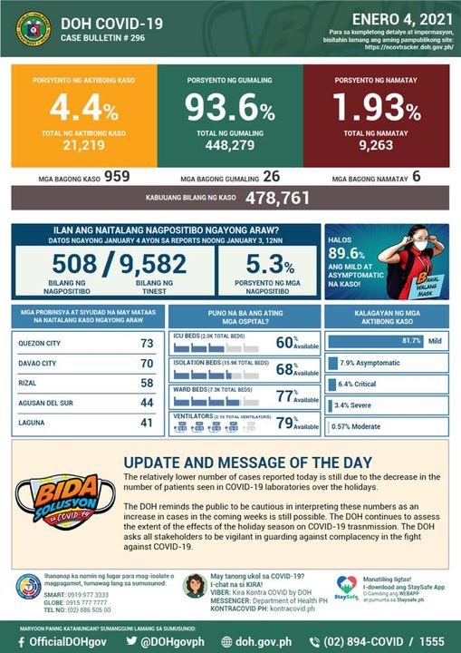 (Eagle News) — COVID-19 cases in the country reached 478,761 on Monday, January 4, after the Department of Health reported 959 additional cases.