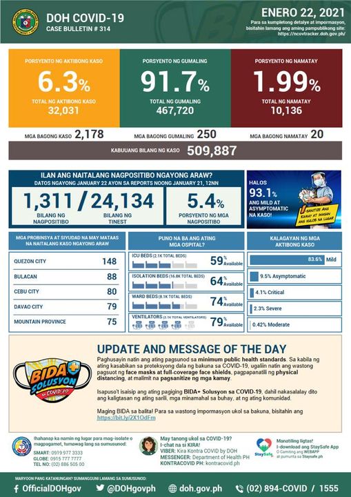 (Eagle News) — COVID-19 cases in the country climbed to 509,887 on Friday, Jan. 22, after the Department of Health reported 2,178 additional cases.