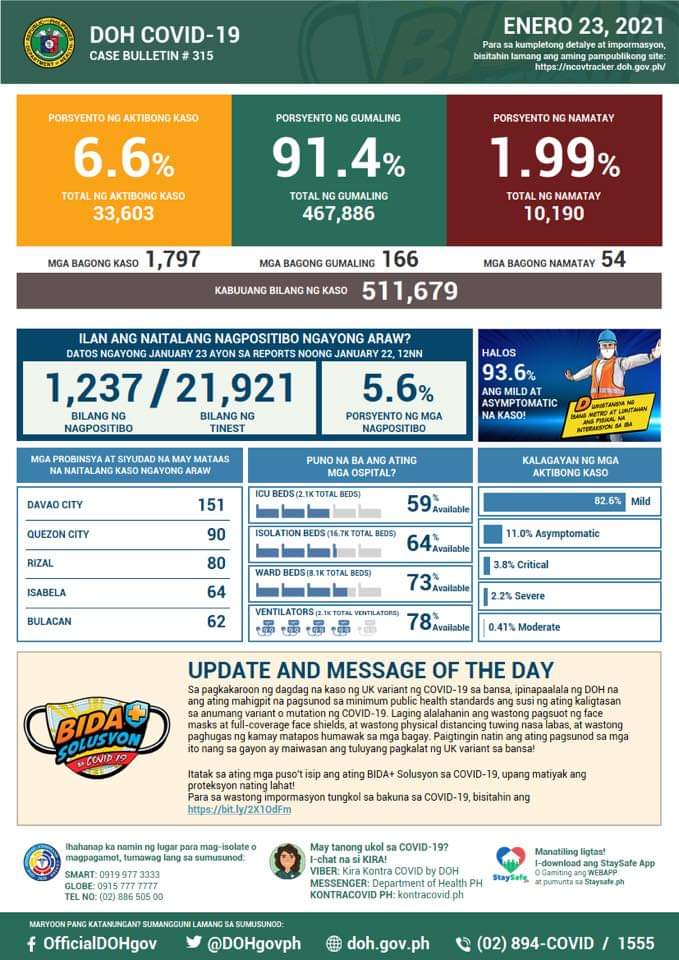 (Eagle News)–COVID-19 cases in the country breached the 511,000 mark on Saturday, Jan. 23, after the Department of Health reported 1797 additional cases.