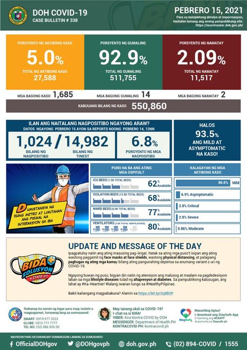 (Eagle News) — COVID-19 cases in the Philippines reached 550,860 on Monday, Feb. 15, after the Department of Health reported 1685 additional cases.