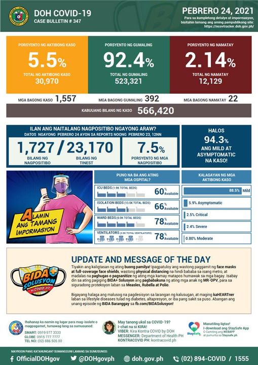 (Eagle News) — COVID-19 cases in the Philippines reached 566,420 on Wednesday, Feb. 24, after the Department of Health reported 1557 additional cases.