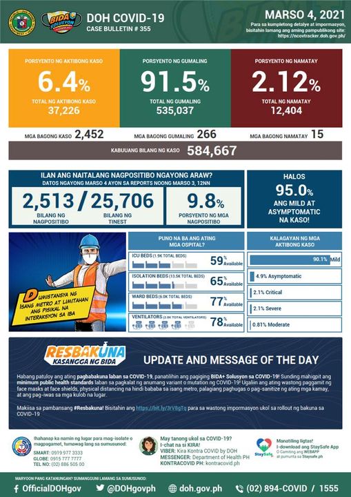 (Eagle News) — COVID-19 cases in the Philippines reached 584,667 after the Department of Health reported 2,452 additional cases.