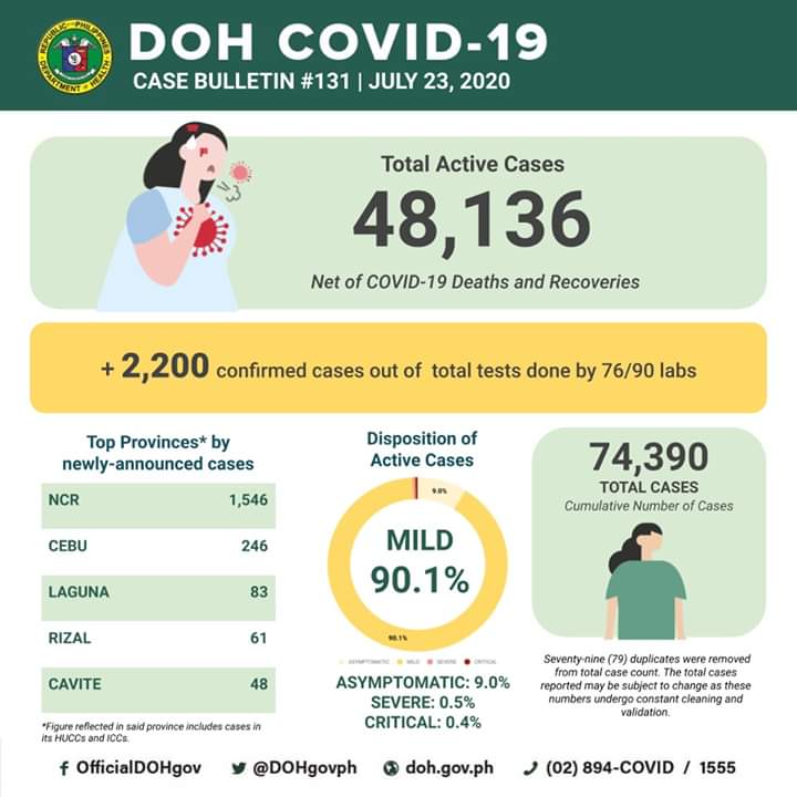 (Eagle News)–The number of coronavirus disease 2019 cases in the country breached the 74000 mark on Thursday, July 23, after the Department of Health reported 2200 cases on the same day.