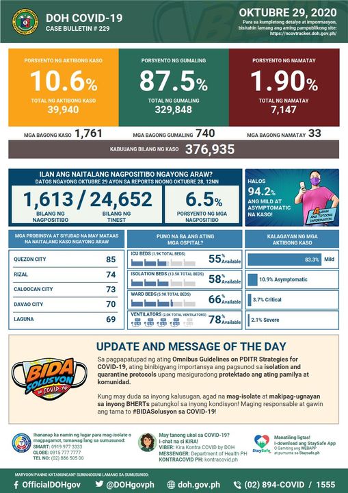 (Eagle News) — COVID-19 cases in the country breached the 376,000 mark on Thursday, Oct. 29, after the Department of Health reported 1761 additional cases.
