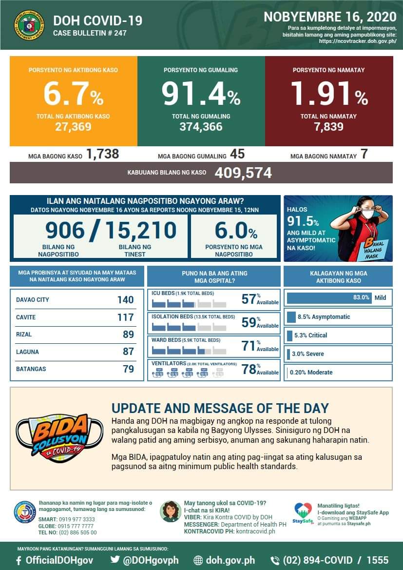(Eagle News)–COVID-19 cases in the country breached the 409,000 mark on Monday, Nov. 16, after the Department of Health reported 1738 additional cases.