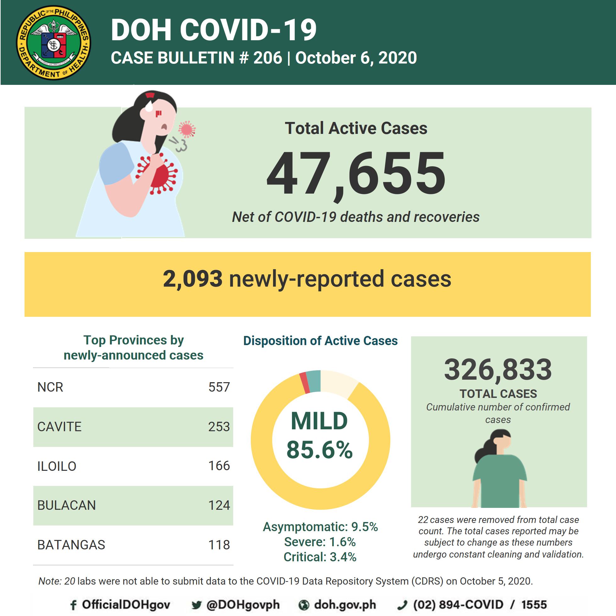 (Eagle News) — COVID-19 cases in the country reached 326,833 on Tuesday, Oct. 6, after the Department of Health reported 2,093 more cases.