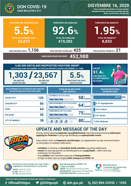 (Eagle News) — COVID-19 cases in the country breached the 452,000 mark on Wednesday, December 16, after the Department of Health reported 1156 additional cases.