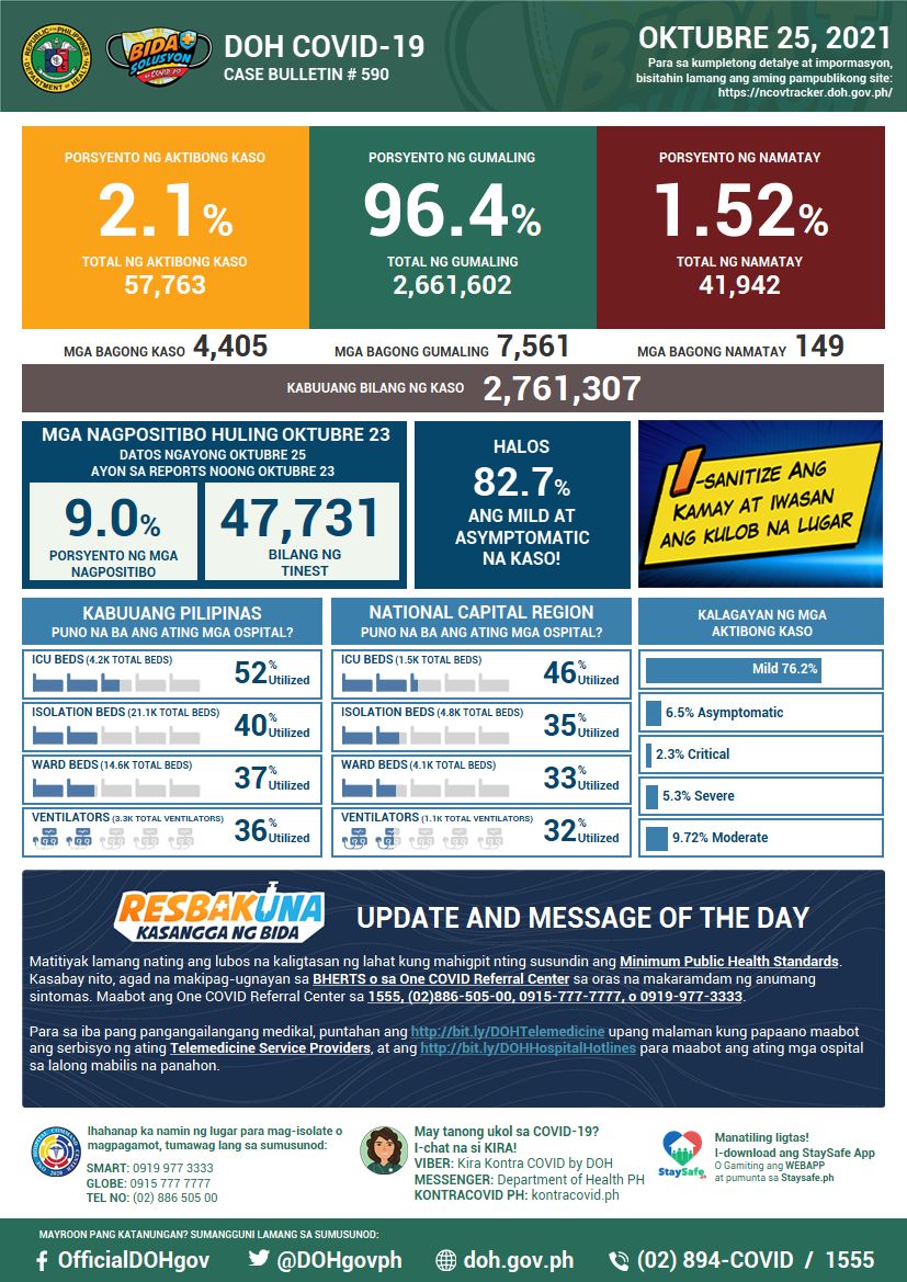 (Eagle News) — COVID-19 cases in the Philippines rose to 2,761,307 with the addition of 4,405 additional cases.