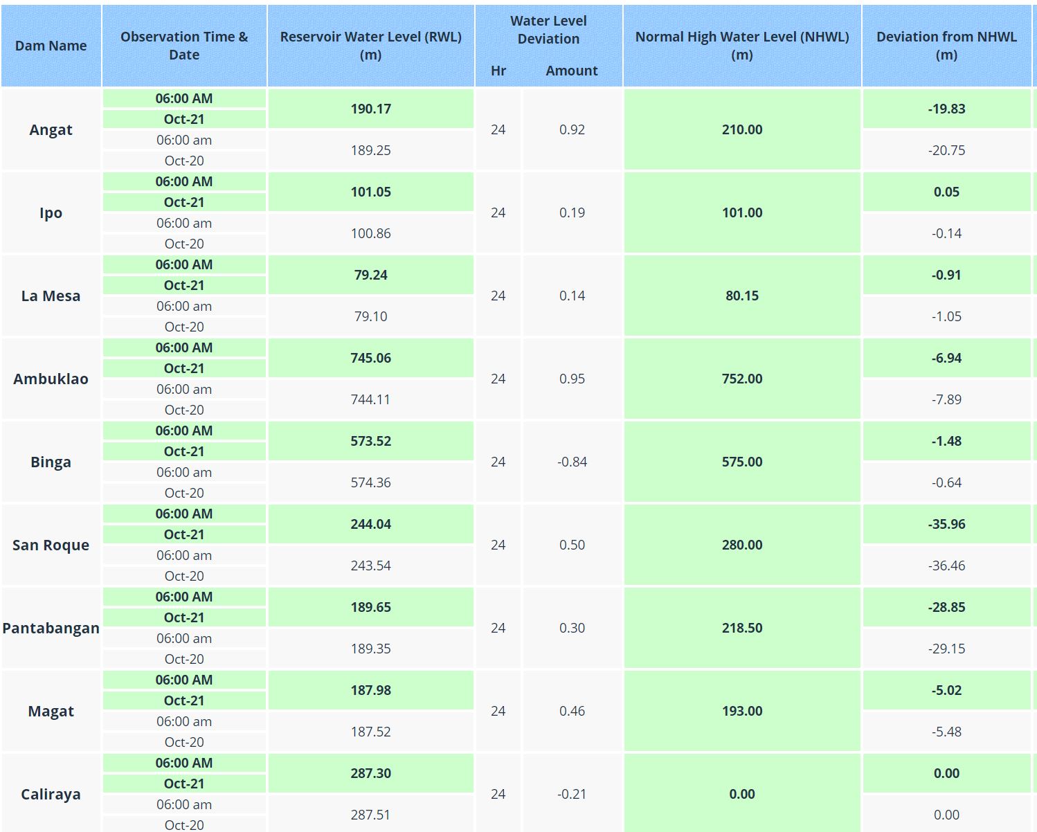 As of 6 a.m. of Oct. 21, Ambuklao’s reservoir water level stood at 745.06 meters, which was almost a meter above the previous day’s 744.11 meters.