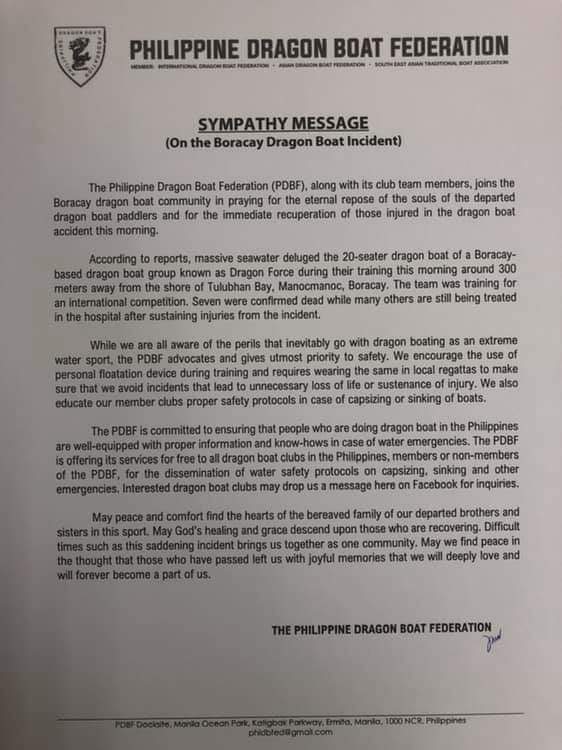 (Eagle News)–The Philippine Dragon Boat Federation on Wednesday, Sept. 25, condoled with the kin of the seven paddlers who died after their dragon boat sank off Boracay waters.