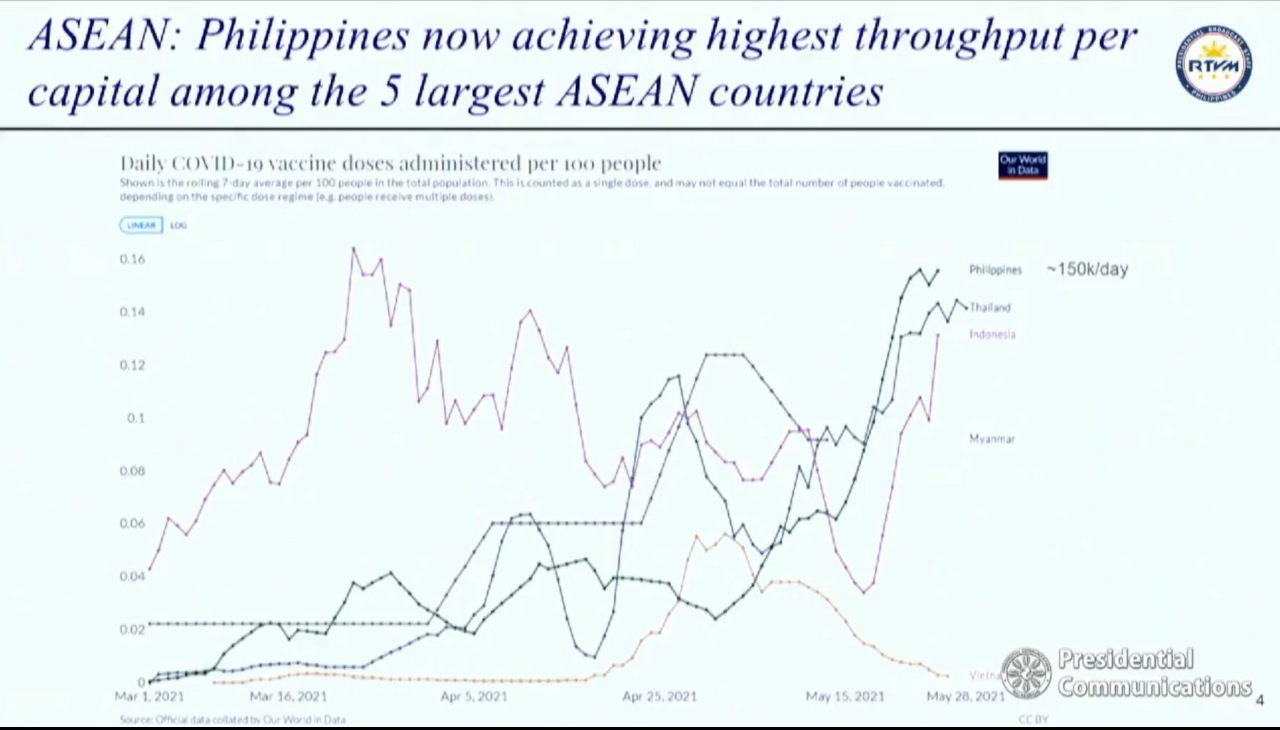“Ngayon po ang Pilipinas na ay mayroon ng pinakamataas na vaccine administration throughput o ‘yong tinatawag natin na tempo dahil sa ASEAN po, tayo po ang pinakamataas na 150,000 per day,” he said.