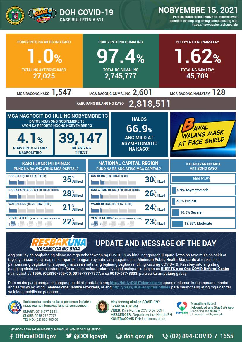 (Eagle News) — COVID-19 cases in the Philippines rose to 2,818,511 on Monday, Nov. 15, after the Department of Health reported 1,547 additional cases.