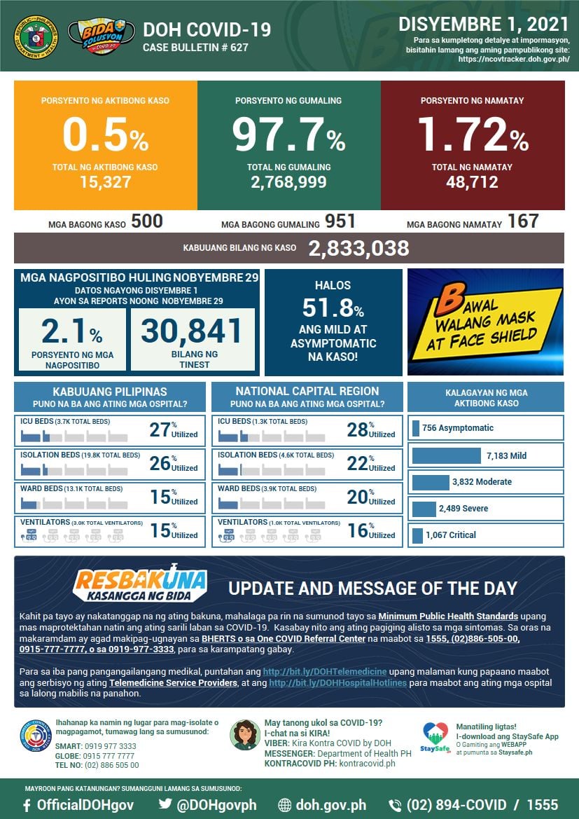 (Eagle News) — COVID-19 cases in the Philippines rose to 2833038 on Wednesday, Dec. 1, after the Department of Health reported 500 more COVID-19 cases.