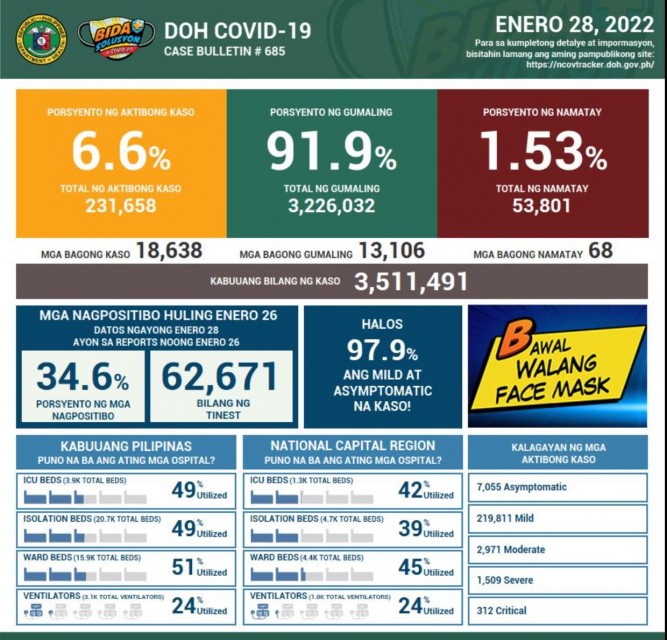 (Eagle News) – For the second straight day, new Covid-19 cases inched higher on Friday, January 28, as the Department of Health recorded 18,638 new cases.