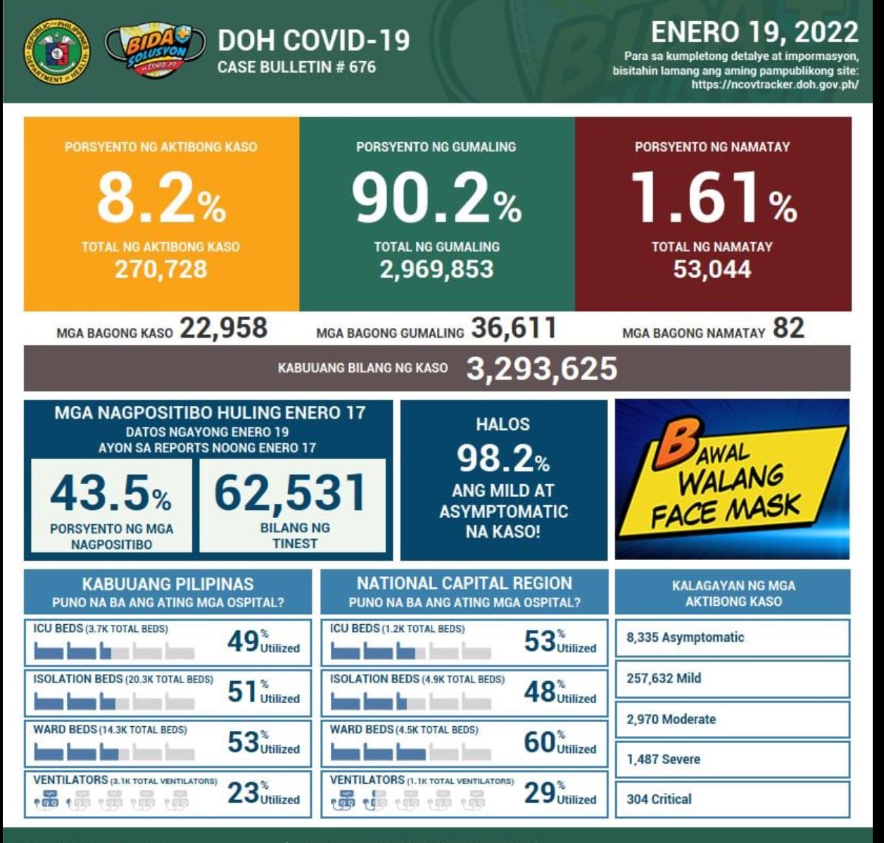 (Eagle News) — For the second straight day, new COVID-19 recoveries exceeded the number of new virus cases on Wednesday, January 19, 2022. New recoveries reached 36,611 while new cases were only 22,958.