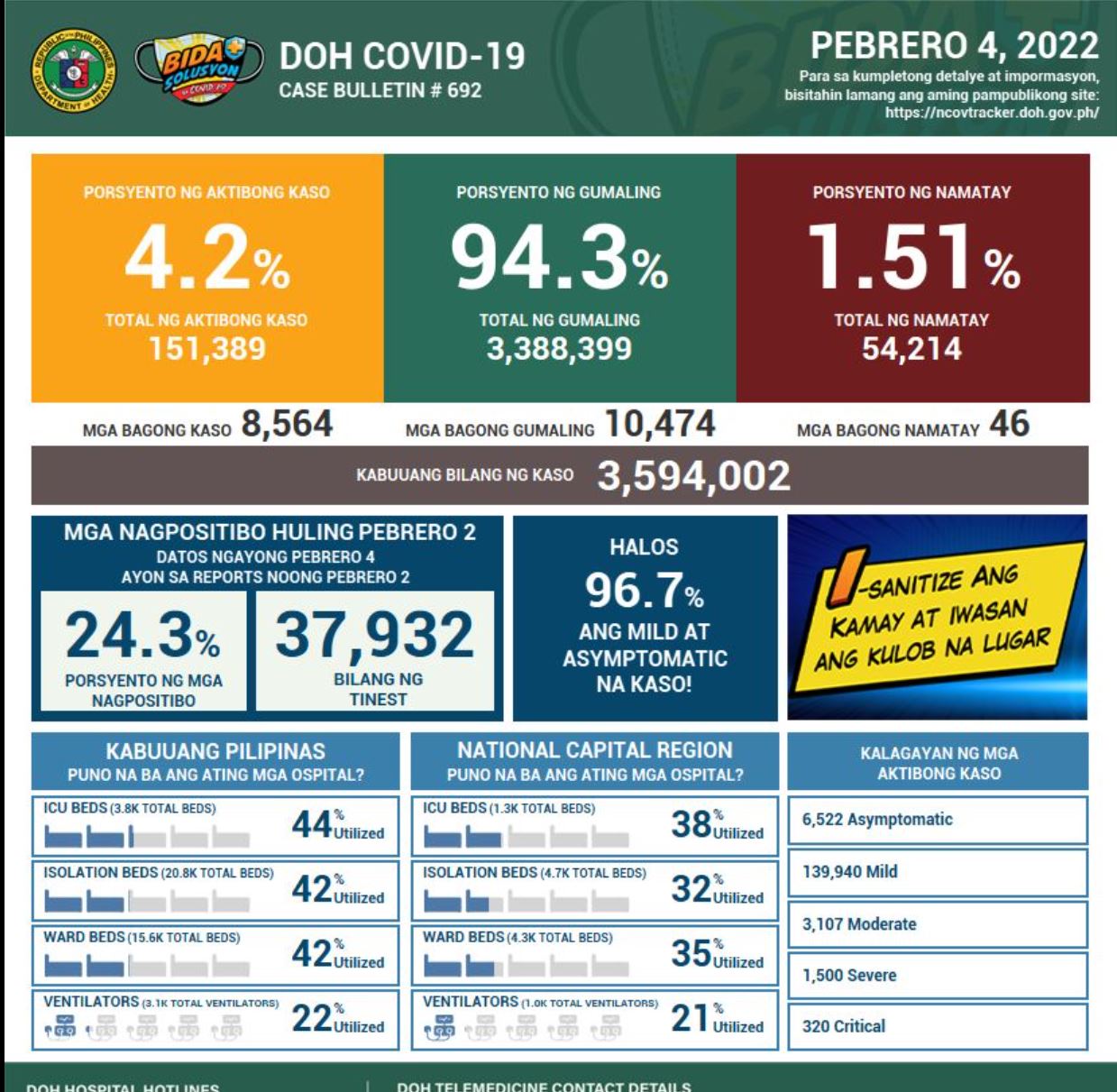Based on the DOH data, most of the active cases are still either mild or asymptomatic at 96.7 percent. This is lower by 0.1 percent compared to the 96.8 percent on Thursday, February 3.