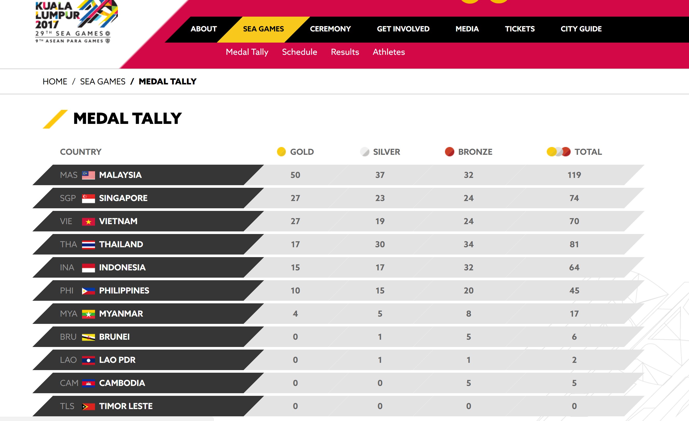 Host country Malaysia remains on top in the medal tally with a gold haul of 50, followed by Singapore and Vietnam with 27 gold medals each, Thailand with 17 gold medals, and Indonesia with 15 gold medals.