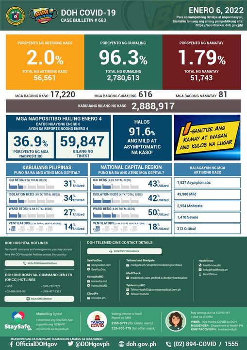 (Eagle News) — COVID-19 cases in the Philippines rose to 2,888,917 on Thursday, Jan. 6, after the Department of Health reported 17220 additional cases.