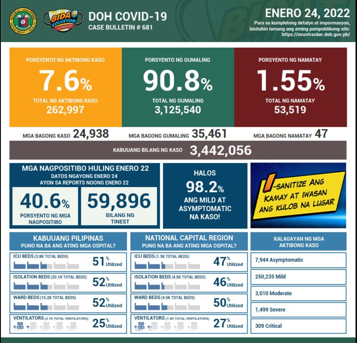 (Eagle News) – The Department of Health (DOH) reported 24,938 new Covid-19 cases on Monday, January 24, the third straight day that the country posted decreasing new virus cases.