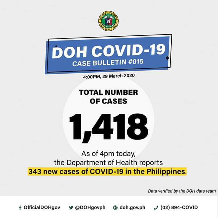 (Eagle News)–The Philippines has confirmed 343 new coronavirus disease 2019 cases, bringing the total to 1418.