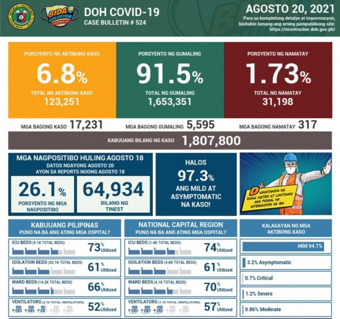 The percentage of recoveries continued to decline since the COVID-19 Delta variant entered the country. On Friday, Aug. 20, it stood at 91.5 percent, after only 5,595 recoveries were reported. Total COVID recoveries hit 1,653,35 so far.