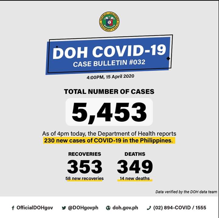 (Eagle News)–The number of coronavirus disease 2019 cases in the country has reached 5453, with the addition of 230 cases, the Department of Health said on Wednesday, April 15.