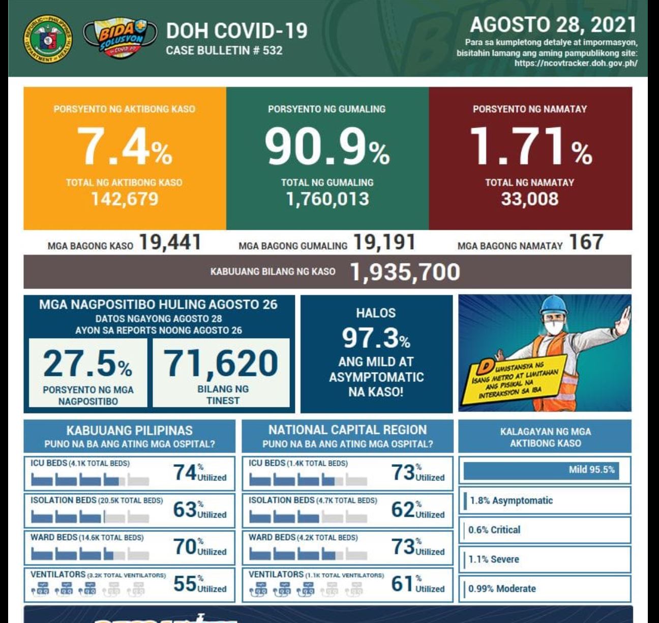 Total active cases have reached 142,679 or 7.4 percent of the total COVID-19 cases. Total COVID-19 cases hit 1,935,700 as of Saturday, Aug. 28.