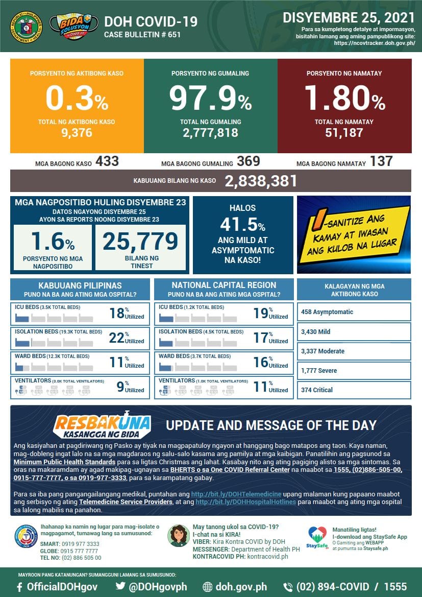 (Eagle News) — COVID-19 cases in the Philippines rose to 2,838,381 on Saturday, Dec. 25, after the Department of Health reported 433 additional cases.