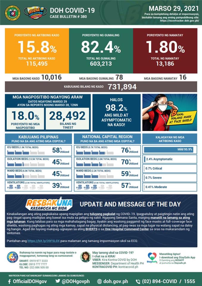 (Eagle News) — Philippine COVID-19 cases reached 731,894 on Monday, March 29, after the Department of Health reported 10,016 additional cases.
