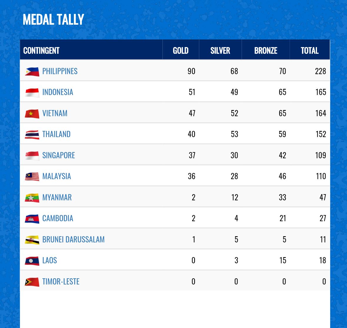 Sixth is Malaysia with 36 gold medals, 28 silvers, and 46 bronzes; seventh is Myanmar with two golds, 12 silvers and 33 bronzes; eighth is Cambodia with two golds, four silvers and 21 bronzes; ninth is Brunei Darussalam with one gold, five silvers and five bronzes; while 10th is Laos with three silvers and 15 bronzes.