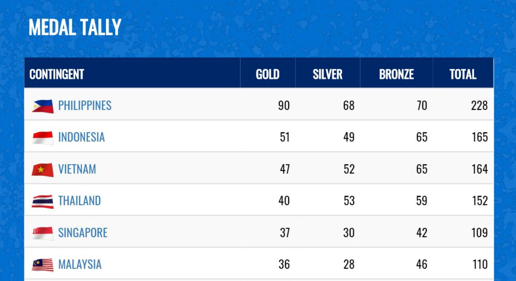 Aside from the 90 golds, the host country also bagged 68 silvers and 70 bronze medals, for a total medal haul of 228