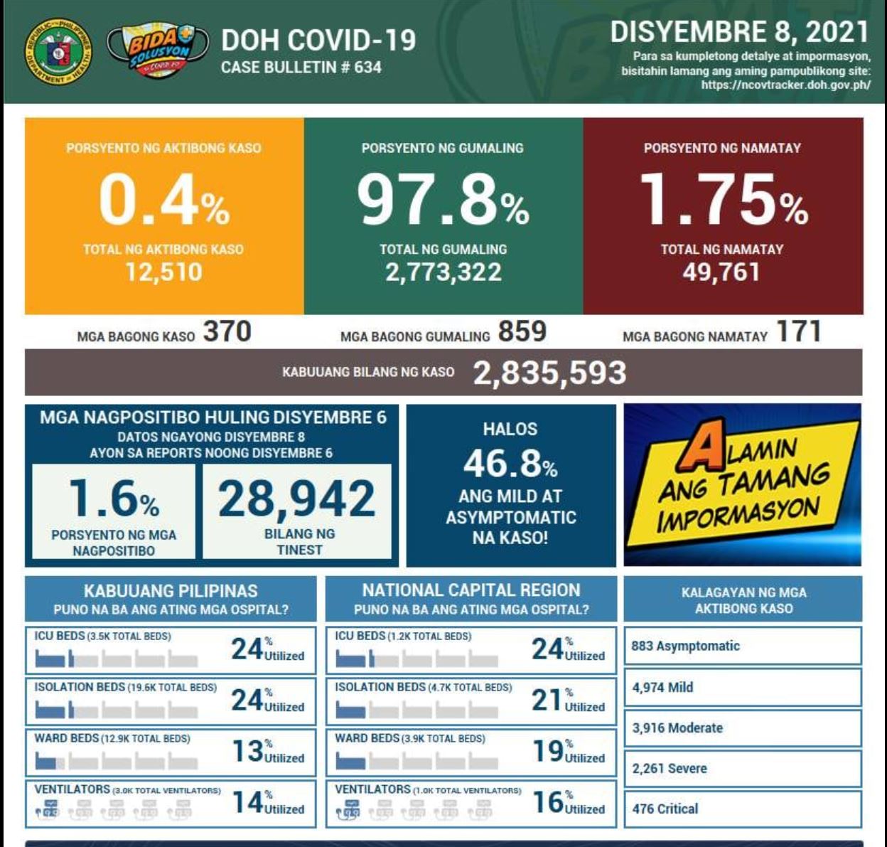 Reported recoveries on Wednesday, December 8, reached 859 bringing the total recoveries to 2,773,322 or 97.8 percent of the 2,835,593 total COVID cases.