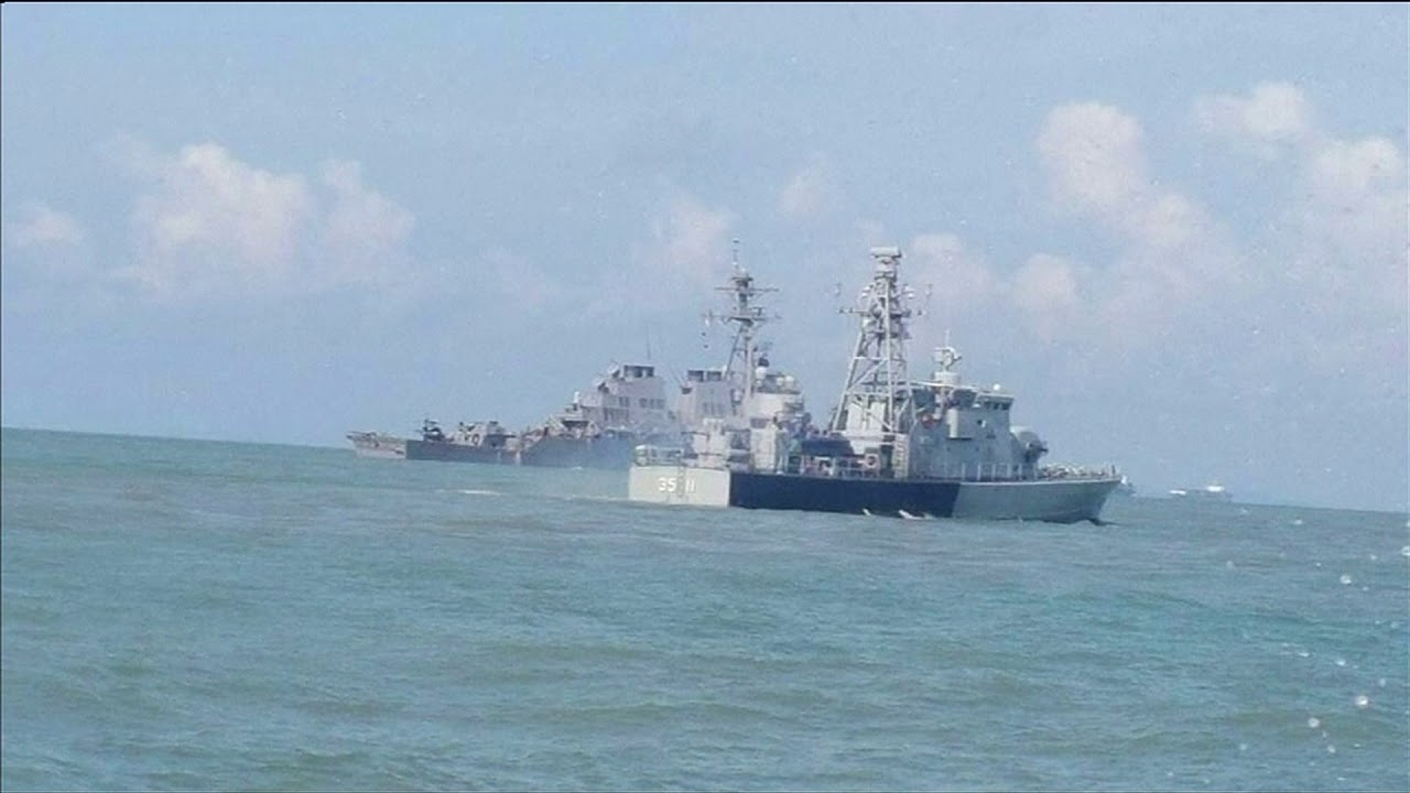 Still photographs released by the Malaysian Royal Navy, which is involved in the search and rescue along with Singaporean ships, helicopters and tug boats, as well as US Navy aircraft, showed damage to the port side of the warship.