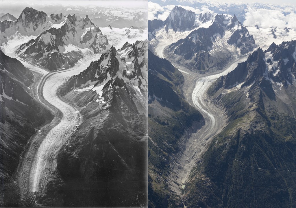 The result is a startling contrast between the sprawling, glistening glaciers of the early 20th century and swathes of dull, dried earth today.