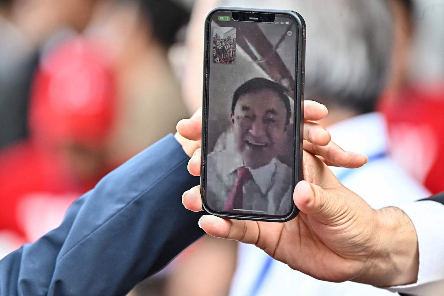 A mobile phone calling former Thai Prime Minister Thaksin Shinawatra on his plane is seen as supporters wait outside Bangkok’s Don Mueang airport on August 22, 2023. Hundreds of supporters gathered Tuesday to welcome Thailand’s divisive ex-leader Thaksin Shinawatra as he returns from 15 years in exile hours before a deadlocked parliament votes for a new prime minister. (Photo by Lillian SUWANRUMPHA / AFP)
