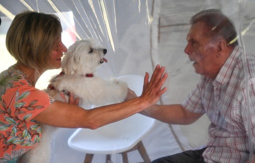 “Today, with this bubble… they can talk, see each other without masks and almost touch,” said Bernard, who recounts seeing one couple kiss through the plastic.