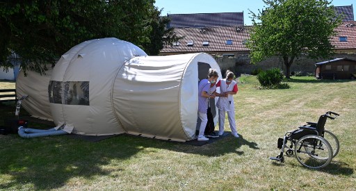 “We wanted to restore a humane dimension to a totally inhumane situation while guaranteeing safety, the non-transmission” of the virus, said Pierre-Stephane Dumas, of BubbleTree, the company that designed the tent.
