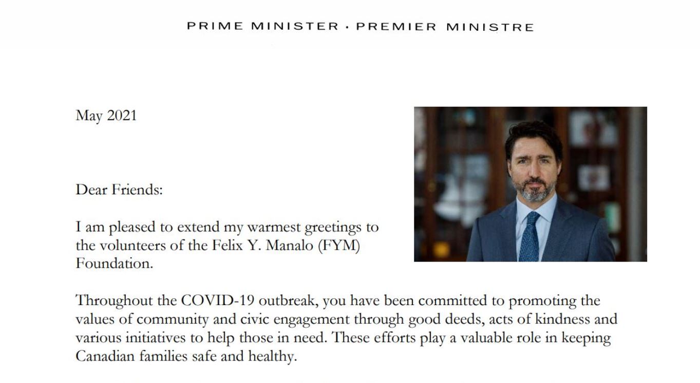 Trudeau sent his message through a letter to the volunteers of the FYM Foundation.