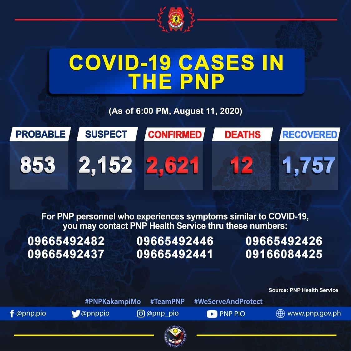 The Philippine National Police said with the development as of Tuesday night, the number of COVID-19 cases in their ranks rises to 2621.