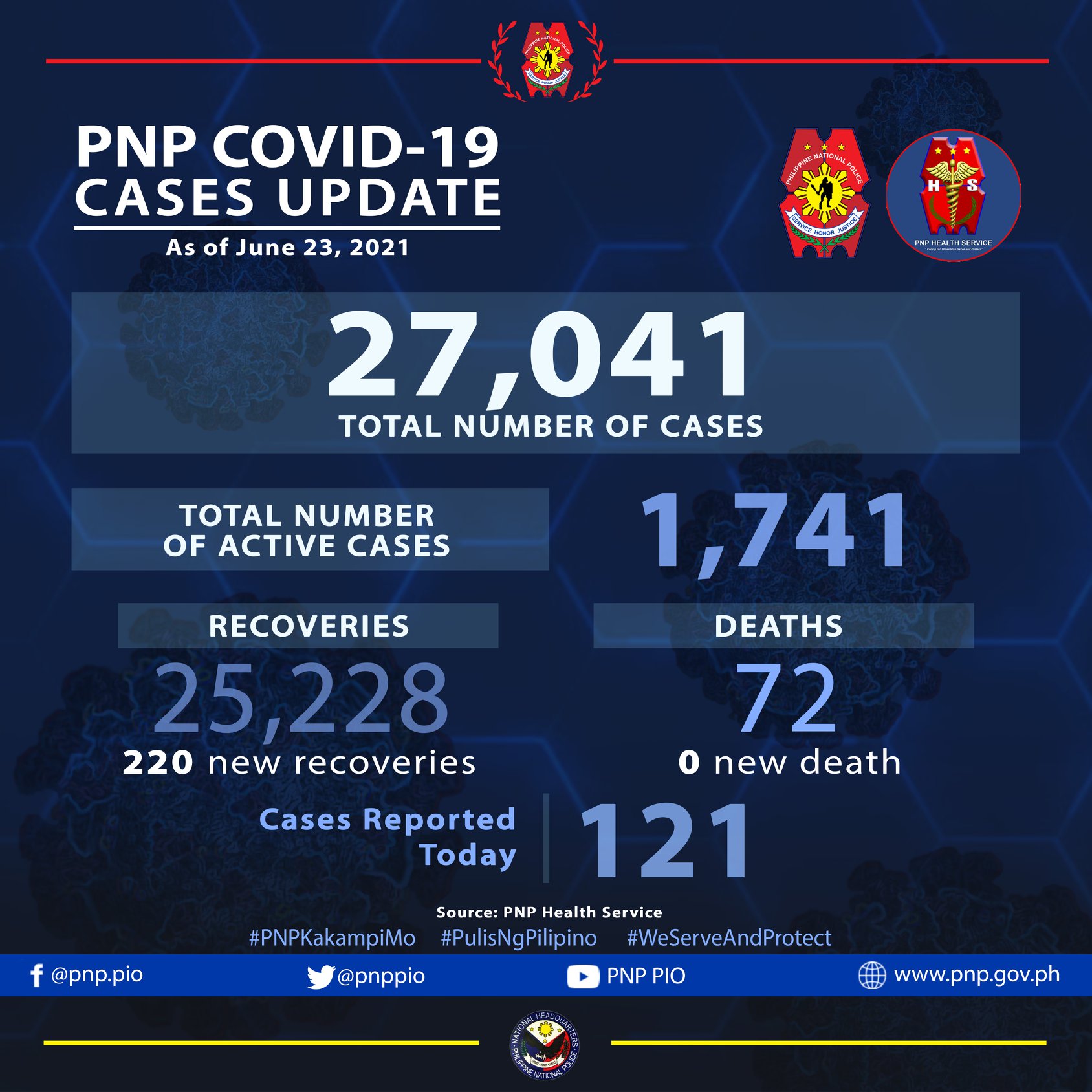 The Philippine National Police said the additional 121 cases pushed the PNP COVID-19 total to 27,041.