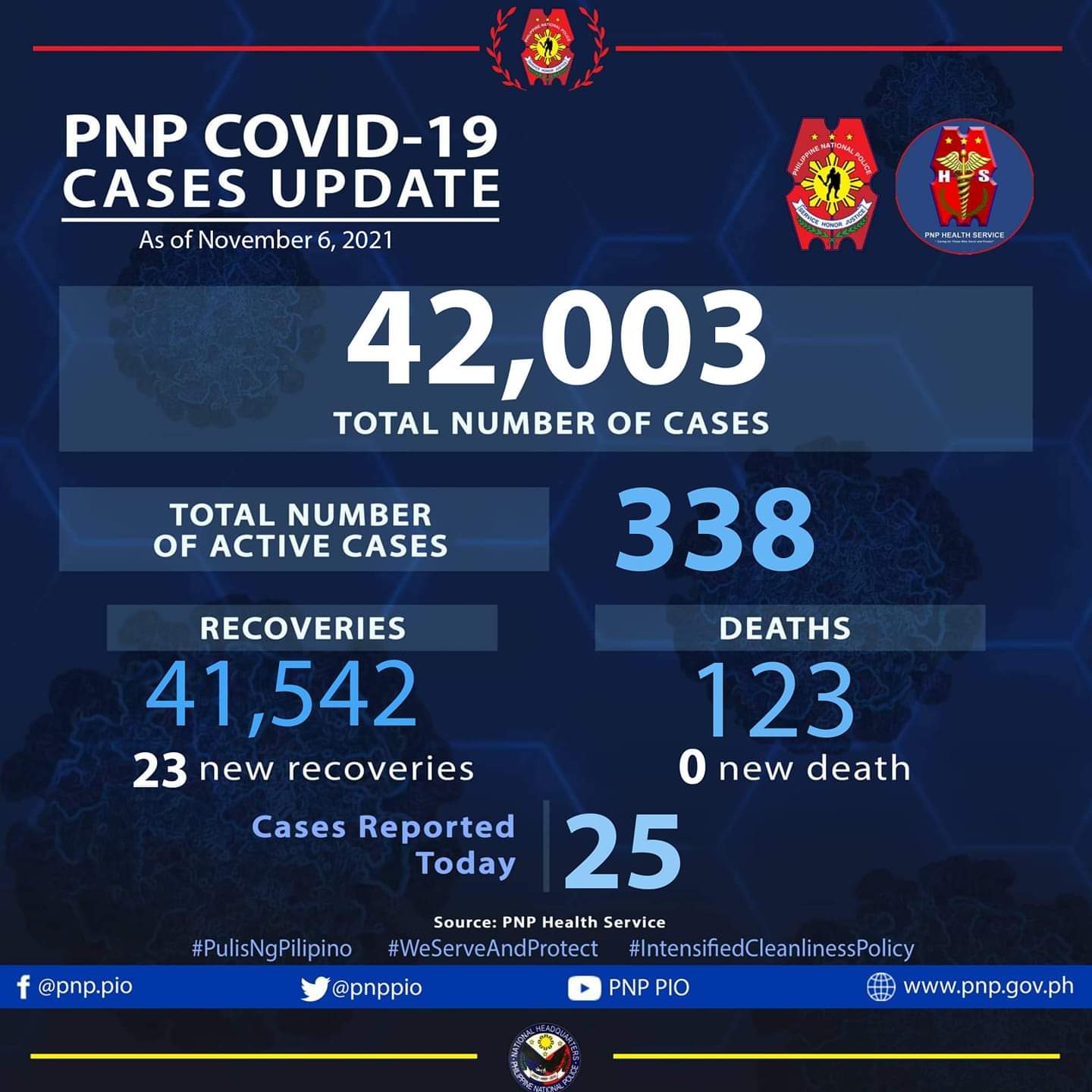 (Eagle News)–COVID-19 cases among police personnel have breached the 42,000 mark, Philippine National Police data showed on Saturday, Nov. 6.