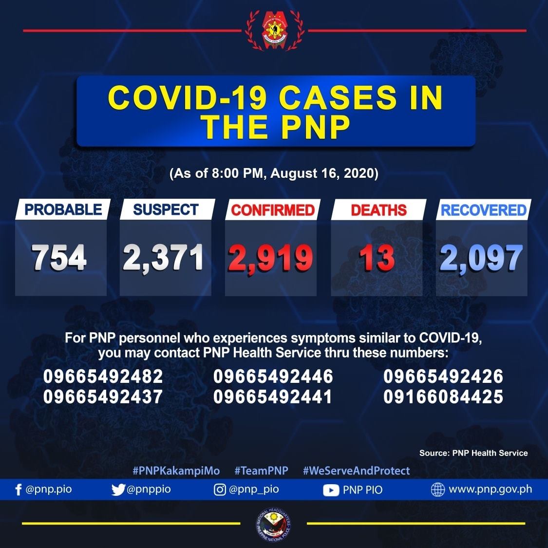 (Eagle News) — COVID-19 cases among police personnel are nearing the 3,000 mark, with the total rising to 2919.