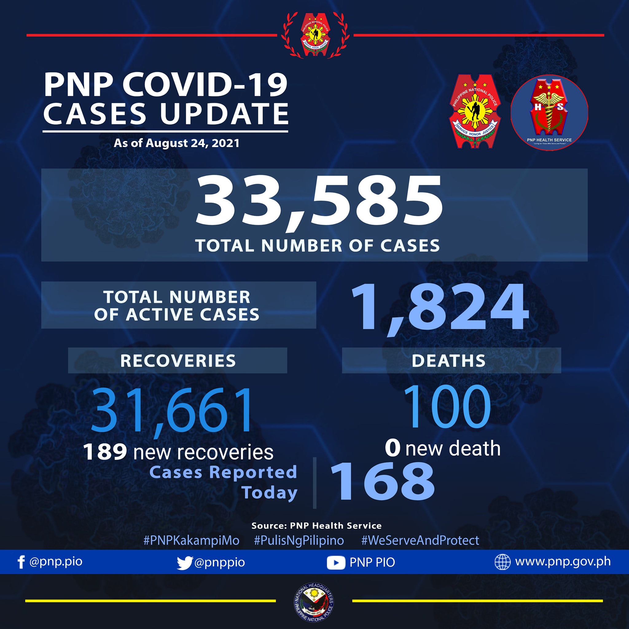 Meanwhile, 168 more COVID-19 cases have been reported among police personnel, pushing the total PNP COVID-19 cases to 33585.