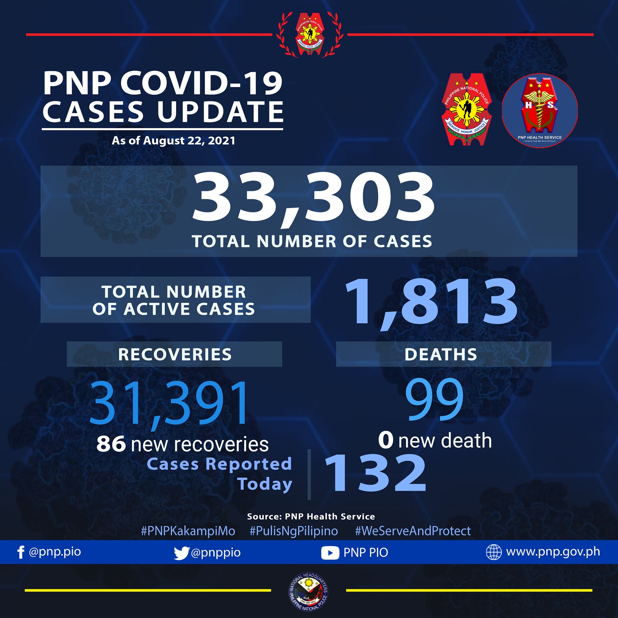Philippine National Police data showed the additional 132 cases pushed the total PNP COVID-19 cases to 33303.