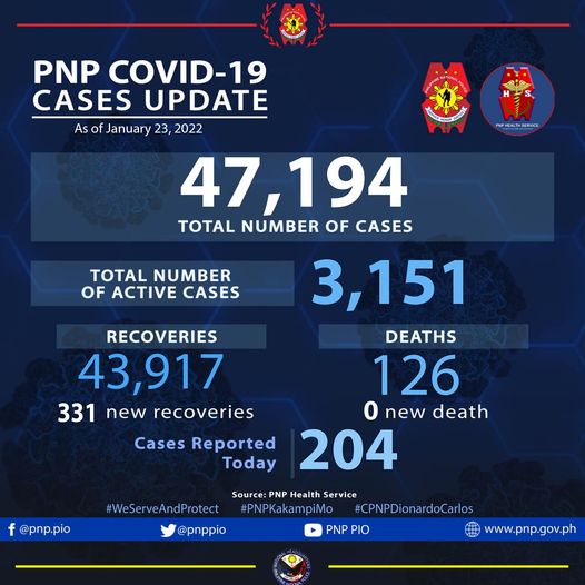 According to the Philippine National Police, the additional 204 PNP cases pushed the PNP COVID-19 total to 47194.