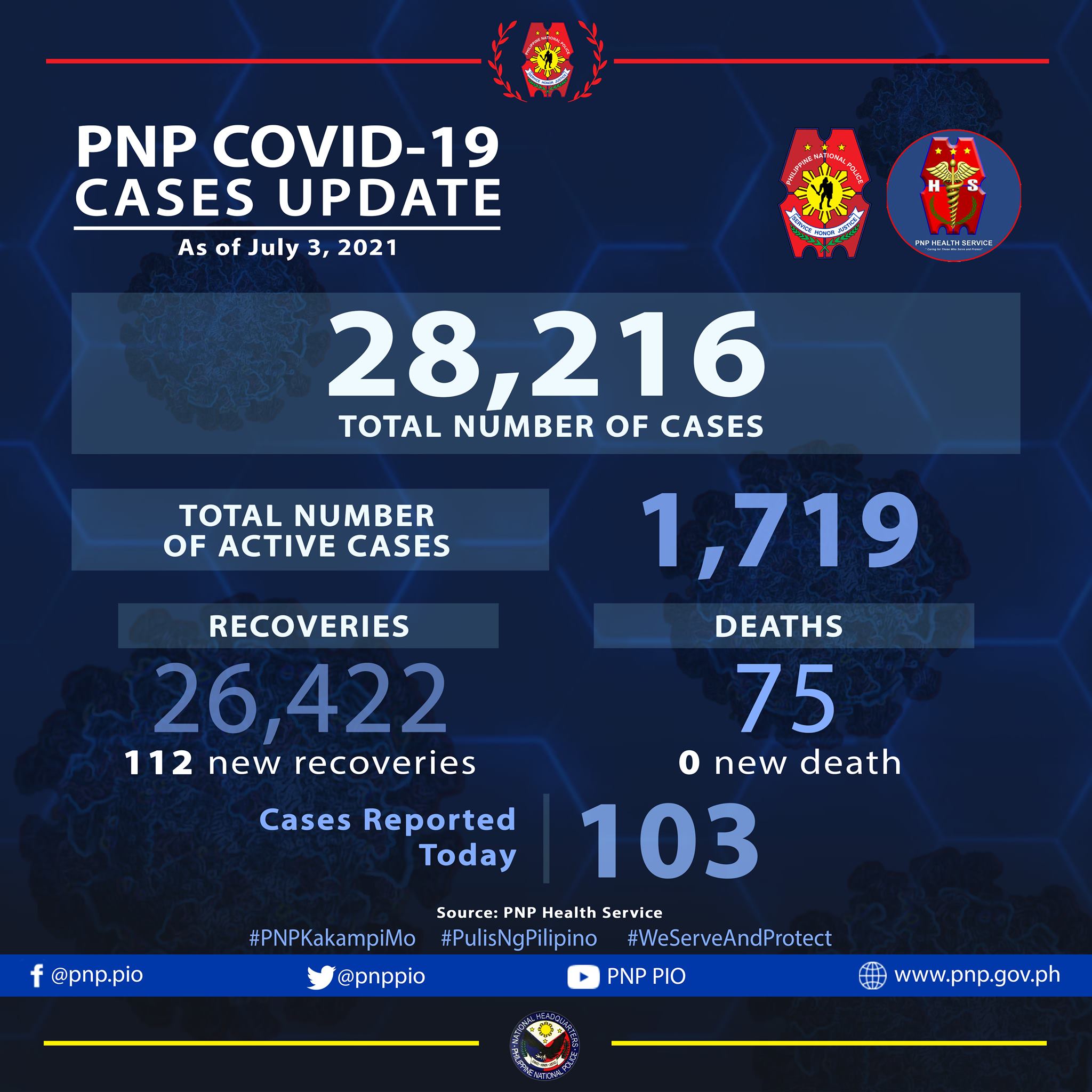 Meanwhile, 103 more COVID-19 cases were reported among police personnel, pushing the PNP COVID-19 total to 28216.