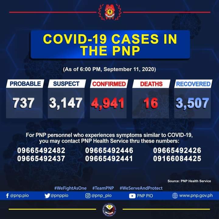 According to the PNP, as of Friday night, the tally of recoveries among police personnel has reached 3507, 111 recoveries more than the 3396 reported on Thursday night.